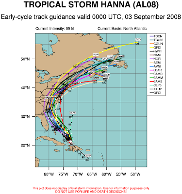 The 8 PM update shows that both Hanna and Ike have increased their maximum sustained wind speeds. Hanna is still a strong tropical storm with winds of 65 mph, and Ike is now a category 3 major hurricane, with winds of 115 mph. Hanna is still expected to make landfall near the NC/SC border early Saturday morning, while Ike is expected to reach the Bahamas by the beginning of next week. I'll have another update later tonight.